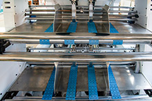 上下層底紙輸送均采用伺服電機(jī)與高強(qiáng)真空吸附相結(jié)合,確保瓦楞紙輸送精、準(zhǔn)、快。